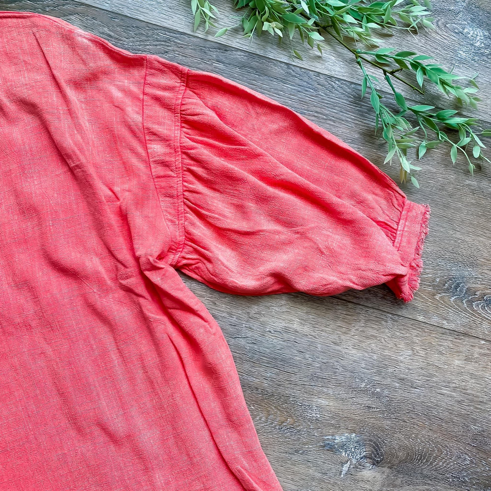 Gorgeous bright coral linen blend top from Umgee is the perfect Summer piece. Features a 3/4 length sleeve with frayed detail